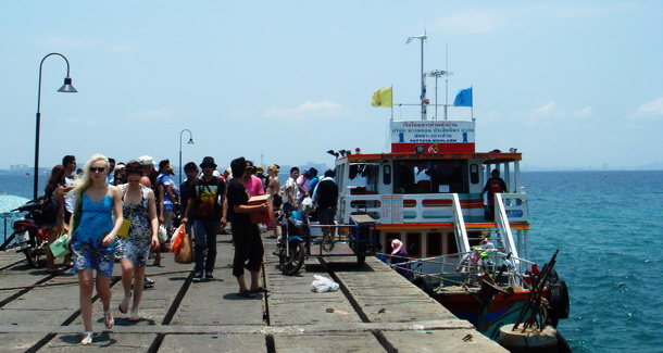 ก็ถึงท่าเรือพัทยา อันดับแรกไปจอง ตั๋วเรือเกาะล้าน กันก่อน เช็ครอบเรือเกาะล้านที่ท่าเรือว่ามีรอบไหนบ้าง ค่าตั๋วเรือ ท่านละ 30 บาท พอซื้อตั๋วเรือเรียบร้อยแล้วคราวนี้ก็ซื้ออาหารทะเล จำพวก กุ้ง หอย ปู ปลา(หมึก) เพื่อนำไปปิ้งย่างเป็นมื้อเย็นกันที่เกาะล้าน แถวๆ ท่าเรือพัทยาจะมีร้านขายอาหารทะเลอยู่ใกล้ๆ ราคาก็ไม่แพงมาก น่าจะถูกกว่าบนเกาะล้าน ให้แม่ค้าแพ็คใส่น้ำแข็งให้ด้วยอาหารทะเลจะได้สด พอถึงเวลาก็ขึ้นเดินไปขึ้นเรือเที่ยวเกาะล้านบริเวณท่าขึ้นเรือหรือท่านใดไม่อยากเดินก็นั่งรถสองแถวเพื่อไปยังจุดขึ้นเรือค่าบริการท่านละ 10 บาท พอคนขึ้นครบแล้วก็ออกเดินทางกันได้เลย เรือที่ใช้รับส่งนักท่องเที่ยวจะเป็นเรือลำใหญ่มีสองชั้น ให้ท่านได้เลือกนั่งอยากชมวิวสวยๆ ลมเย็นๆ ก็เชิญด้านบน อยากสัมผัสลมเย็นๆ ยิ่งกว่าก็เชิญด้านหน้าของเรือ ใช้เวลาในการเดินทางไปเที่ยวเกาะล้านใช้เวลาประมาณ 30 นาที ก็ถึงท่าเรือหน้าบ้านของเกาะล้านแล้ว